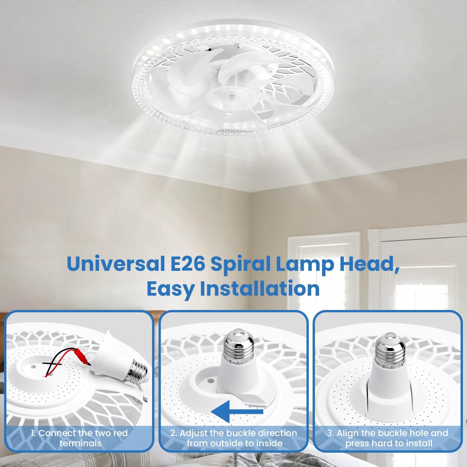 ✨【No Wiring Ceiling Fan, Easy Installation】No Wiring, no electricians required, just screw into the bulb socket, compatible with any standard e26/e27 lamp holder. the 4-inch extended e26 base allows the socket fan light to be installed anywhere you need a fast fan. Screw in the fan and light combination in less than a minute, and you can enjoy bright lights and cool wind. Anyone can save the expensive cost of hiring an electrician.